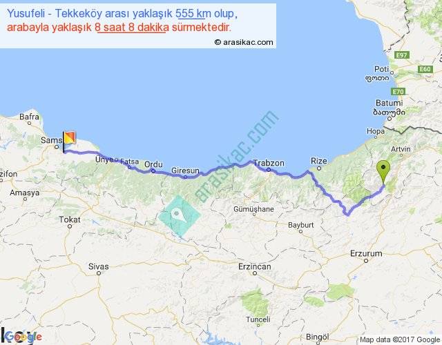 Yusufeli - Tekkeköy arası yaklaşık olarak 90 km/h ile yukarıda belirtilen sürede olup, iki yerin kuş uçuşu uzaklığı (mesafesi) 426'dir. Eğer belirtilen yerler arasında uçak seferi var ise bu süre uçakla 39 dakika'ya kadar düşebilir. Yolculuk otobüsle 10 saat 34 dakika sürmektedir.