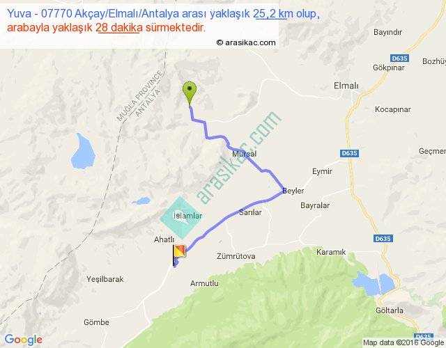 Yuva - 07770 Akçay Elmalı Antalya arası yaklaşık olarak 90 km/h ile yukarıda belirtilen sürede olup, iki yerin kuş uçuşu uzaklığı (mesafesi) 14'dir. Yolculuk otobüsle 36 dakika sürmektedir.