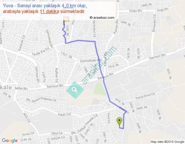 Yuva - Sanayi arası yaklaşık olarak 90 km/h ile yukarıda belirtilen sürede olup, iki yerin kuş uçuşu uzaklığı (mesafesi) 3'dir. Yolculuk otobüsle 14 dakika sürmektedir.
