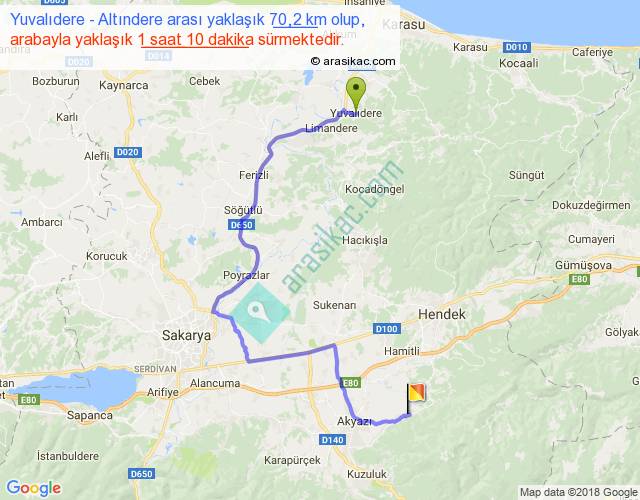 Yuvalıdere - Altındere arası yaklaşık olarak 90 km/h ile yukarıda belirtilen sürede olup, iki yerin kuş uçuşu uzaklığı (mesafesi) 35'dir. Yolculuk otobüsle 1 saat 31 dakika sürmektedir.