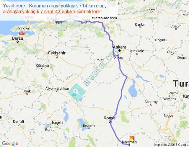 Yuvalıdere - Karaman arası yaklaşık olarak 90 km/h ile yukarıda belirtilen sürede olup, iki yerin kuş uçuşu uzaklığı (mesafesi) 478'dir. Eğer belirtilen yerler arasında uçak seferi var ise bu süre uçakla 44 dakika'ya kadar düşebilir. Yolculuk otobüsle 10 saat 1 dakika sürmektedir.