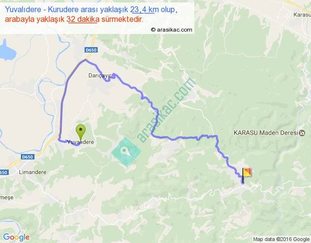 Yuvalıdere - Kurudere arası yaklaşık olarak 90 km/h ile yukarıda belirtilen sürede olup, iki yerin kuş uçuşu uzaklığı (mesafesi) 10'dir. Yolculuk otobüsle 41 dakika sürmektedir.