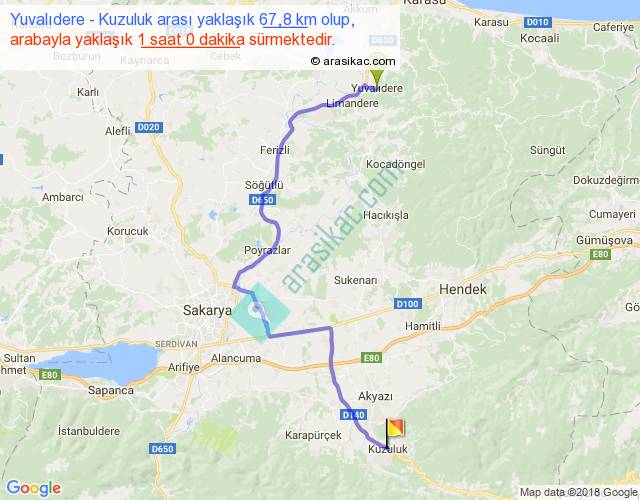 Yuvalıdere - Kuzuluk arası yaklaşık olarak 90 km/h ile yukarıda belirtilen sürede olup, iki yerin kuş uçuşu uzaklığı (mesafesi) 42'dir. Yolculuk otobüsle 1 saat 18 dakika sürmektedir.