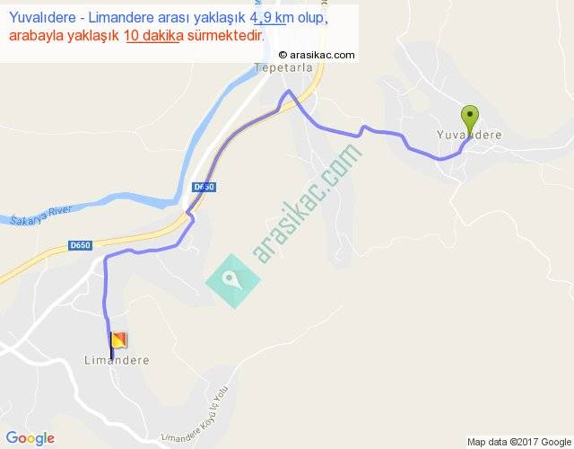 Yuvalıdere - Limandere arası yaklaşık olarak 90 km/h ile yukarıda belirtilen sürede olup, iki yerin kuş uçuşu uzaklığı (mesafesi) 3'dir. Yolculuk otobüsle 13 dakika sürmektedir.