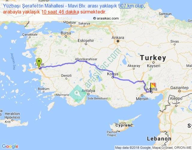 Yüzbaşı Şerafettin Mahallesi - Mavi Blv. arası yaklaşık olarak 90 km/h ile yukarıda belirtilen sürede olup, iki yerin kuş uçuşu uzaklığı (mesafesi) 731'dir. Eğer belirtilen yerler arasında uçak seferi var ise bu süre uçakla 1 saat 07 dakika'ya kadar düşebilir. Yolculuk otobüsle 13 saat 59 dakika sürmektedir.