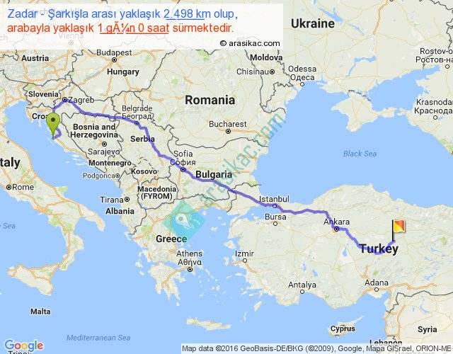 Zadar - Şarkışla arası yaklaşık olarak 90 km/h ile yukarıda belirtilen sürede olup, iki yerin kuş uçuşu uzaklığı (mesafesi) 1819'dir. Eğer belirtilen yerler arasında uçak seferi var ise bu süre uçakla 2 saat 47 dakika'ya kadar düşebilir. Yolculuk otobüsle 1 gün 7 saat sürmektedir.