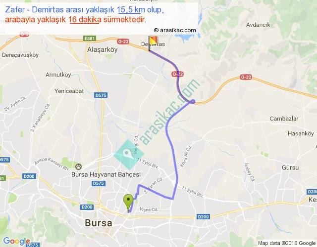 Zafer - Demirtas arası yaklaşık olarak 90 km/h ile yukarıda belirtilen sürede olup, iki yerin kuş uçuşu uzaklığı (mesafesi) 10'dir. Yolculuk otobüsle 20 dakika sürmektedir.
