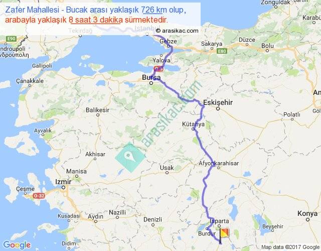 Zafer Mahallesi - Bucak arası yaklaşık olarak 90 km/h ile yukarıda belirtilen sürede olup, iki yerin kuş uçuşu uzaklığı (mesafesi) 470'dir. Eğer belirtilen yerler arasında uçak seferi var ise bu süre uçakla 43 dakika'ya kadar düşebilir. Yolculuk otobüsle 10 saat 27 dakika sürmektedir.