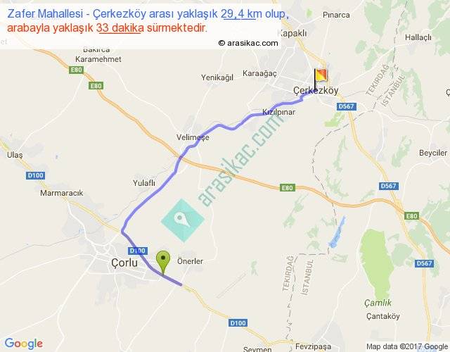 Zafer Mahallesi - Çerkezköy arası yaklaşık olarak 90 km/h ile yukarıda belirtilen sürede olup, iki yerin kuş uçuşu uzaklığı (mesafesi) 19'dir. Yolculuk otobüsle 42 dakika sürmektedir.