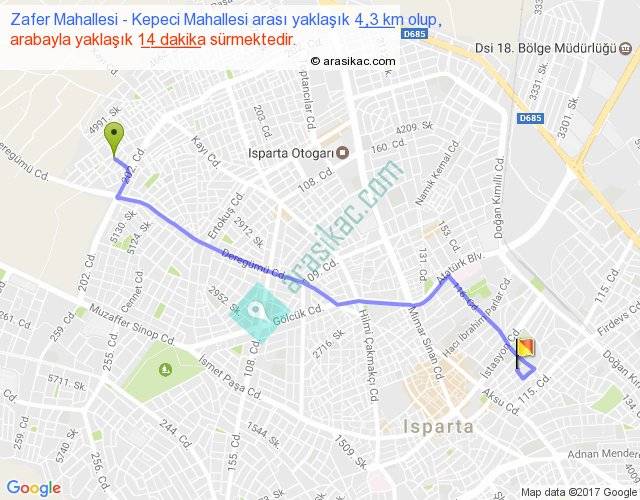 Zafer Mahallesi - Kepeci Mahallesi arası yaklaşık olarak 90 km/h ile yukarıda belirtilen sürede olup, iki yerin kuş uçuşu uzaklığı (mesafesi) 3'dir. Yolculuk otobüsle 18 dakika sürmektedir.