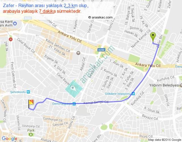 Zafer - Reyhan arası yaklaşık olarak 90 km/h ile yukarıda belirtilen sürede olup, iki yerin kuş uçuşu uzaklığı (mesafesi) 2'dir. Yolculuk otobüsle 9 dakika sürmektedir.