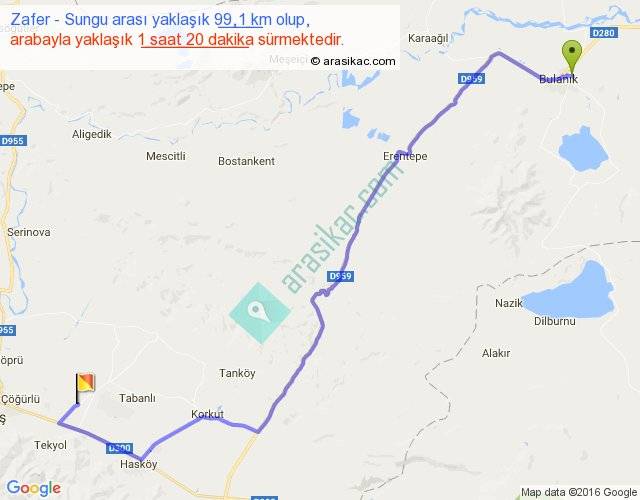 Zafer - Sungu arası yaklaşık olarak 90 km/h ile yukarıda belirtilen sürede olup, iki yerin kuş uçuşu uzaklığı (mesafesi) 70'dir. Yolculuk otobüsle 1 saat 44 dakika sürmektedir.