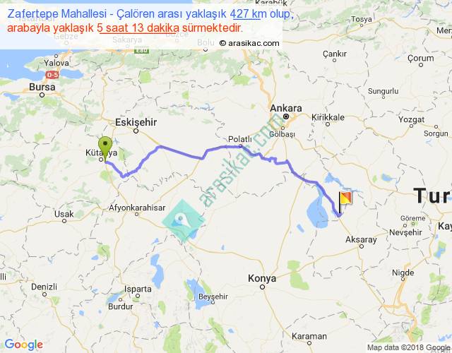 Zafertepe Mahallesi - Çalören arası yaklaşık olarak 90 km/h ile yukarıda belirtilen sürede olup, iki yerin kuş uçuşu uzaklığı (mesafesi) 321'dir. Eğer belirtilen yerler arasında uçak seferi var ise bu süre uçakla 29 dakika'ya kadar düşebilir. Yolculuk otobüsle 6 saat 46 dakika sürmektedir.