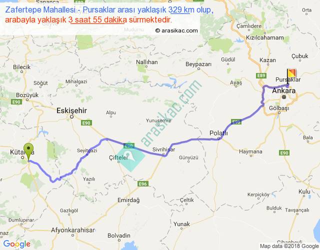 Zafertepe Mahallesi - Pursaklar arası yaklaşık olarak 90 km/h ile yukarıda belirtilen sürede olup, iki yerin kuş uçuşu uzaklığı (mesafesi) 253'dir. Eğer belirtilen yerler arasında uçak seferi var ise bu süre uçakla 23 dakika'ya kadar düşebilir. Yolculuk otobüsle 5 saat 5 dakika sürmektedir.