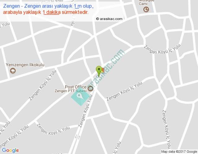 Zengen - Zengen arası yaklaşık olarak 90 km/h ile yukarıda belirtilen sürede olup, iki yerin kuş uçuşu uzaklığı (mesafesi) 0'dir. Yolculuk otobüsle 1 dakika sürmektedir.