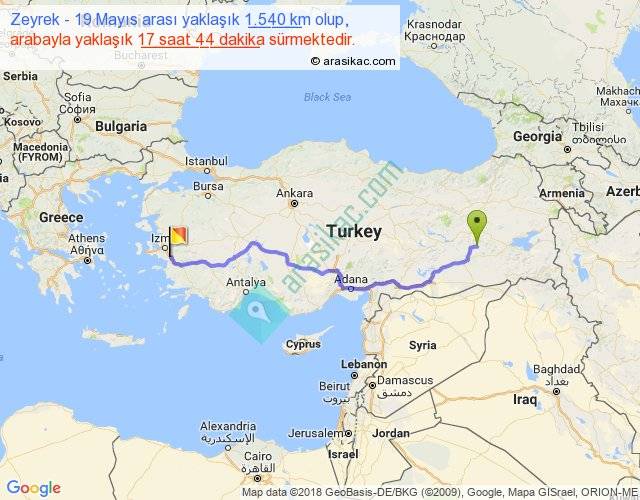 Zeyrek - 19 Mayıs arası yaklaşık olarak 90 km/h ile yukarıda belirtilen sürede olup, iki yerin kuş uçuşu uzaklığı (mesafesi) 1164'dir. Eğer belirtilen yerler arasında uçak seferi var ise bu süre uçakla 1 saat 47 dakika'ya kadar düşebilir. Yolculuk otobüsle 23 saat 3 dakika sürmektedir.