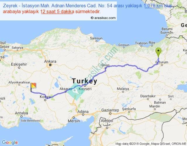 Zeyrek - İstasyon Mah. Adnan Menderes Cad. No: 54 arası yaklaşık olarak 90 km/h ile yukarıda belirtilen sürede olup, iki yerin kuş uçuşu uzaklığı (mesafesi) 844'dir. Eğer belirtilen yerler arasında uçak seferi var ise bu süre uçakla 1 saat 17 dakika'ya kadar düşebilir. Yolculuk otobüsle 15 saat 42 dakika sürmektedir.