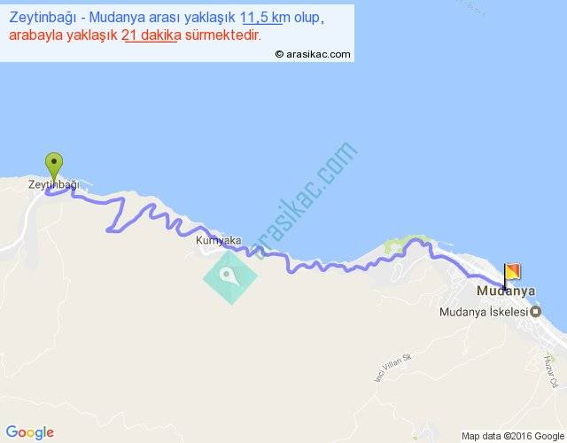 Zeytinbağı - Mudanya arası yaklaşık olarak 90 km/h ile yukarıda belirtilen sürede olup, iki yerin kuş uçuşu uzaklığı (mesafesi) 8'dir. Yolculuk otobüsle 27 dakika sürmektedir.