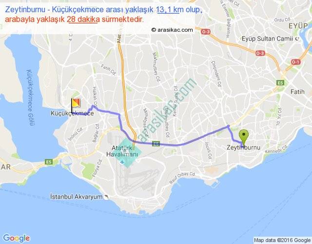 Zeytinburnu - Küçükçekmece arası yaklaşık olarak 90 km/h ile yukarıda belirtilen sürede olup, iki yerin kuş uçuşu uzaklığı (mesafesi) 10'dir. Yolculuk otobüsle 36 dakika sürmektedir.