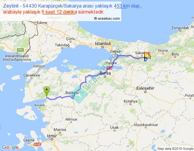 Zeytinli - 54430 Karapürçek Sakarya arası yaklaşık olarak 90 km/h ile yukarıda belirtilen sürede olup, iki yerin kuş uçuşu uzaklığı (mesafesi) 321'dir. Eğer belirtilen yerler arasında uçak seferi var ise bu süre uçakla 29 dakika'ya kadar düşebilir. Yolculuk otobüsle 6 saat 45 dakika sürmektedir.