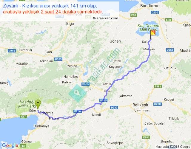 Zeytinli - Kızıksa arası yaklaşık olarak 90 km/h ile yukarıda belirtilen sürede olup, iki yerin kuş uçuşu uzaklığı (mesafesi) 104'dir. Yolculuk otobüsle 3 saat 7 dakika sürmektedir.