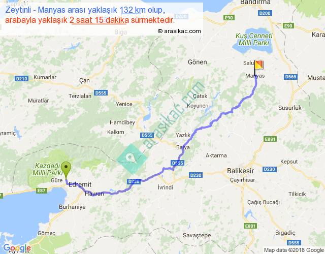 Zeytinli - Manyas arası yaklaşık olarak 90 km/h ile yukarıda belirtilen sürede olup, iki yerin kuş uçuşu uzaklığı (mesafesi) 99'dir. Yolculuk otobüsle 2 saat 55 dakika sürmektedir.