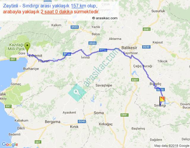 Zeytinli - Sındırgı arası yaklaşık olarak 90 km/h ile yukarıda belirtilen sürede olup, iki yerin kuş uçuşu uzaklığı (mesafesi) 113'dir. Yolculuk otobüsle 2 saat 36 dakika sürmektedir.