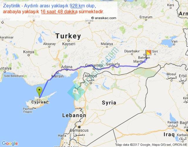 Zeytinlik - Aydınlı arası yaklaşık olarak 90 km/h ile yukarıda belirtilen sürede olup, iki yerin kuş uçuşu uzaklığı (mesafesi) 755'dir. Eğer belirtilen yerler arasında uçak seferi var ise bu süre uçakla 1 saat 09 dakika'ya kadar düşebilir. Yolculuk otobüsle 21 saat 50 dakika sürmektedir.