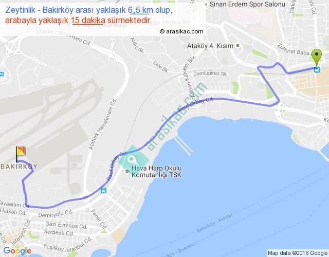 Zeytinlik - Bakirköy arası yaklaşık olarak 90 km/h ile yukarıda belirtilen sürede olup, iki yerin kuş uçuşu uzaklığı (mesafesi) 4'dir. Yolculuk otobüsle 19 dakika sürmektedir.