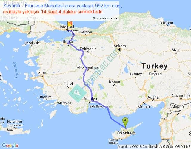 Zeytinlik - Fikirtepe Mahallesi arası yaklaşık olarak 90 km/h ile yukarıda belirtilen sürede olup, iki yerin kuş uçuşu uzaklığı (mesafesi) 726'dir. Eğer belirtilen yerler arasında uçak seferi var ise bu süre uçakla 1 saat 07 dakika'ya kadar düşebilir. Yolculuk otobüsle 18 saat 17 dakika sürmektedir.