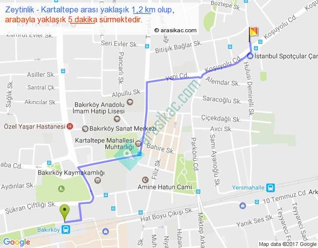 Zeytinlik - Kartaltepe arası yaklaşık olarak 90 km/h ile yukarıda belirtilen sürede olup, iki yerin kuş uçuşu uzaklığı (mesafesi) 1'dir. Yolculuk otobüsle 6 dakika sürmektedir.