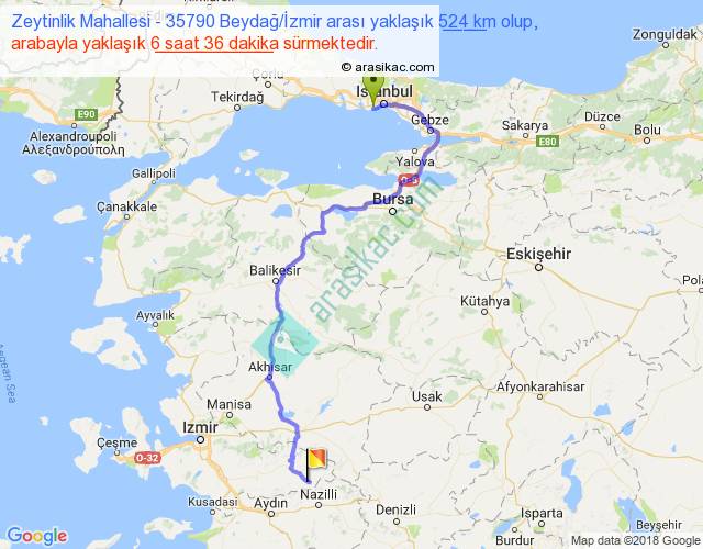 Zeytinlik Mahallesi - 35790 Beydağ İzmir arası yaklaşık olarak 90 km/h ile yukarıda belirtilen sürede olup, iki yerin kuş uçuşu uzaklığı (mesafesi) 324'dir. Eğer belirtilen yerler arasında uçak seferi var ise bu süre uçakla 29 dakika'ya kadar düşebilir. Yolculuk otobüsle 8 saat 34 dakika sürmektedir.