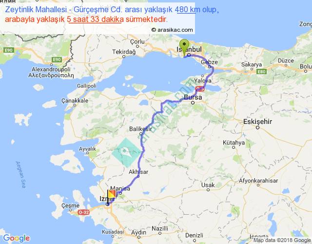 Zeytinlik Mahallesi - Gürçeşme Cd. arası yaklaşık olarak 90 km/h ile yukarıda belirtilen sürede olup, iki yerin kuş uçuşu uzaklığı (mesafesi) 319'dir. Eğer belirtilen yerler arasında uçak seferi var ise bu süre uçakla 29 dakika'ya kadar düşebilir. Yolculuk otobüsle 7 saat 12 dakika sürmektedir.