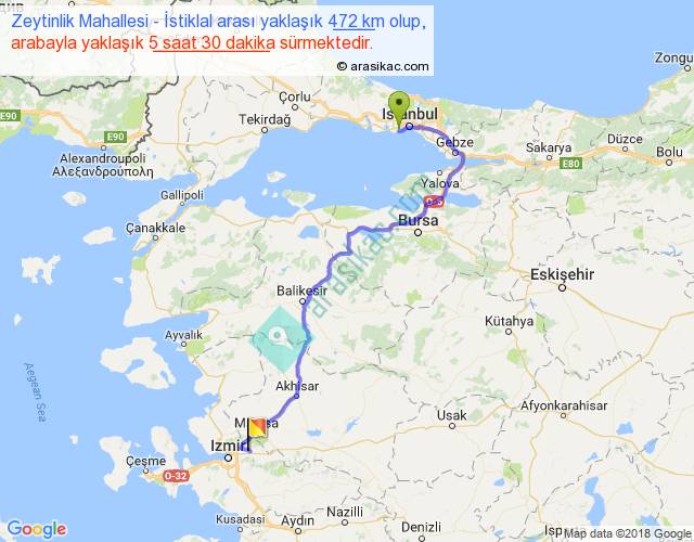 Zeytinlik Mahallesi - İstiklal arası yaklaşık olarak 90 km/h ile yukarıda belirtilen sürede olup, iki yerin kuş uçuşu uzaklığı (mesafesi) 305'dir. Eğer belirtilen yerler arasında uçak seferi var ise bu süre uçakla 28 dakika'ya kadar düşebilir. Yolculuk otobüsle 7 saat 9 dakika sürmektedir.