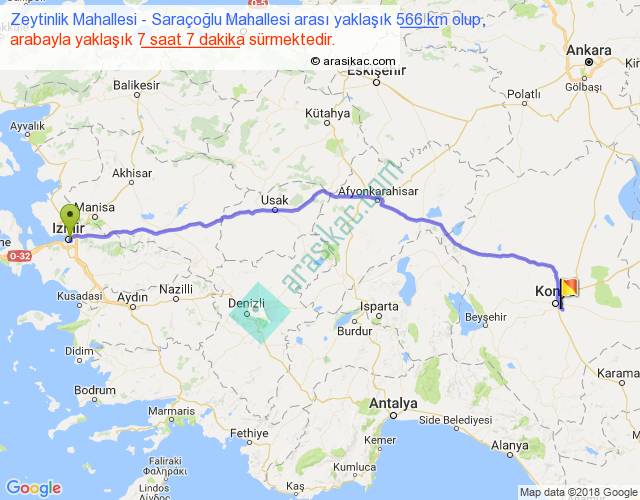 Zeytinlik Mahallesi - Saraçoğlu Mahallesi arası yaklaşık olarak 90 km/h ile yukarıda belirtilen sürede olup, iki yerin kuş uçuşu uzaklığı (mesafesi) 474'dir. Eğer belirtilen yerler arasında uçak seferi var ise bu süre uçakla 43 dakika'ya kadar düşebilir. Yolculuk otobüsle 9 saat 15 dakika sürmektedir.