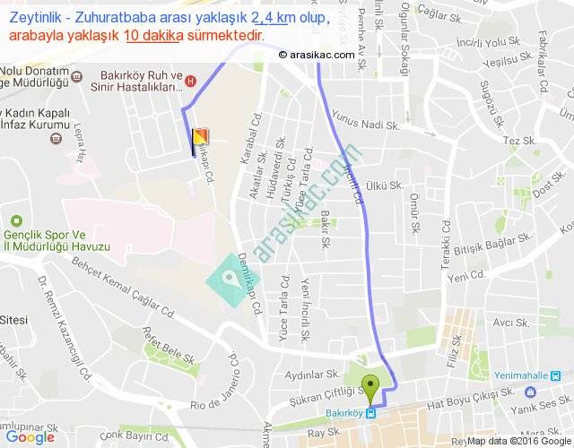Zeytinlik - Zuhuratbaba arası yaklaşık olarak 90 km/h ile yukarıda belirtilen sürede olup, iki yerin kuş uçuşu uzaklığı (mesafesi) 1'dir. Yolculuk otobüsle 13 dakika sürmektedir.