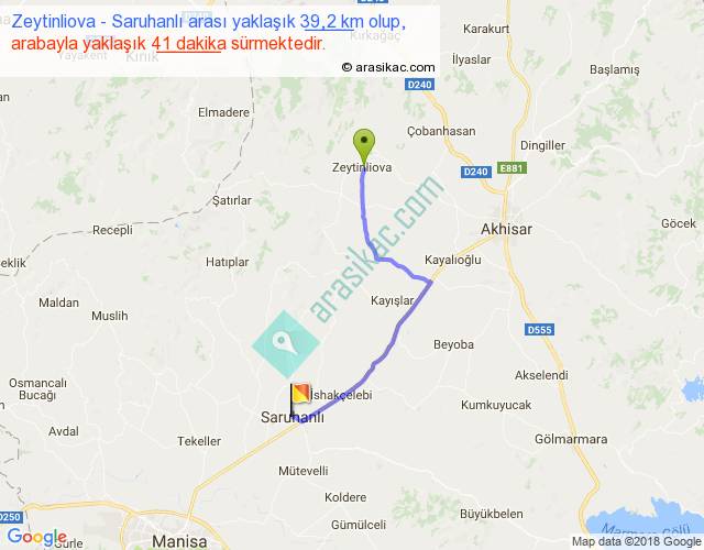Zeytinliova - Saruhanlı arası yaklaşık olarak 90 km/h ile yukarıda belirtilen sürede olup, iki yerin kuş uçuşu uzaklığı (mesafesi) 28'dir. Yolculuk otobüsle 53 dakika sürmektedir.