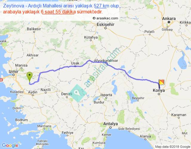 Zeytinova - Ardıçlı Mahallesi arası yaklaşık olarak 90 km/h ile yukarıda belirtilen sürede olup, iki yerin kuş uçuşu uzaklığı (mesafesi) 416'dir. Eğer belirtilen yerler arasında uçak seferi var ise bu süre uçakla 38 dakika'ya kadar düşebilir. Yolculuk otobüsle 8 saat 59 dakika sürmektedir.