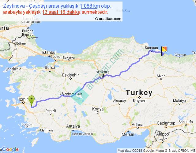 Zeytinova - Çaybaşı arası yaklaşık olarak 90 km/h ile yukarıda belirtilen sürede olup, iki yerin kuş uçuşu uzaklığı (mesafesi) 856'dir. Eğer belirtilen yerler arasında uçak seferi var ise bu süre uçakla 1 saat 19 dakika'ya kadar düşebilir. Yolculuk otobüsle 17 saat 14 dakika sürmektedir.