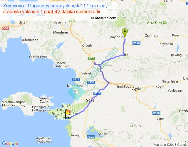 Zeytinova - Doğanbey arası yaklaşık olarak 90 km/h ile yukarıda belirtilen sürede olup, iki yerin kuş uçuşu uzaklığı (mesafesi) 81'dir. Yolculuk otobüsle 2 saat 12 dakika sürmektedir.