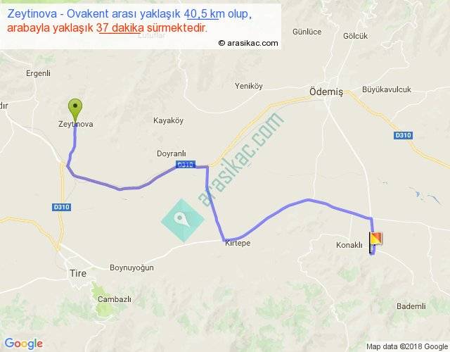 Zeytinova - Ovakent arası yaklaşık olarak 90 km/h ile yukarıda belirtilen sürede olup, iki yerin kuş uçuşu uzaklığı (mesafesi) 27'dir. Yolculuk otobüsle 48 dakika sürmektedir.