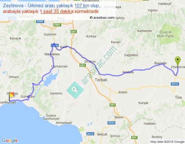 Zeytinova - Ürkmez arası yaklaşık olarak 90 km/h ile yukarıda belirtilen sürede olup, iki yerin kuş uçuşu uzaklığı (mesafesi) 71'dir. Yolculuk otobüsle 2 saat 3 dakika sürmektedir.