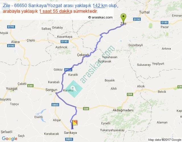 Zile - 66650 Sarıkaya Yozgat arası yaklaşık olarak 90 km/h ile yukarıda belirtilen sürede olup, iki yerin kuş uçuşu uzaklığı (mesafesi) 95'dir. Yolculuk otobüsle 2 saat 29 dakika sürmektedir.