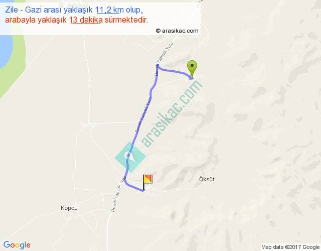 Zile - Gazi arası yaklaşık olarak 90 km/h ile yukarıda belirtilen sürede olup, iki yerin kuş uçuşu uzaklığı (mesafesi) 7'dir. Yolculuk otobüsle 16 dakika sürmektedir.