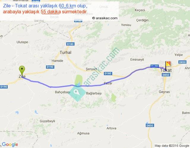 Zile - Tokat arası yaklaşık olarak 90 km/h ile yukarıda belirtilen sürede olup, iki yerin kuş uçuşu uzaklığı (mesafesi) 56'dir. Yolculuk otobüsle 1 saat 11 dakika sürmektedir.