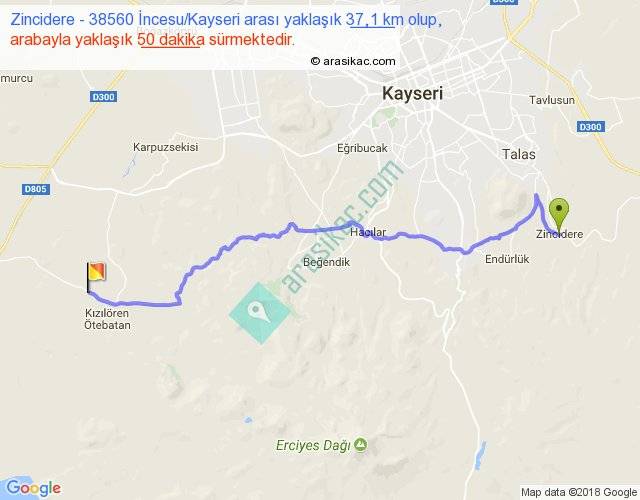 Zincidere - 38560 İncesu Kayseri arası yaklaşık olarak 90 km/h ile yukarıda belirtilen sürede olup, iki yerin kuş uçuşu uzaklığı (mesafesi) 28'dir. Yolculuk otobüsle 1 saat 5 dakika sürmektedir.