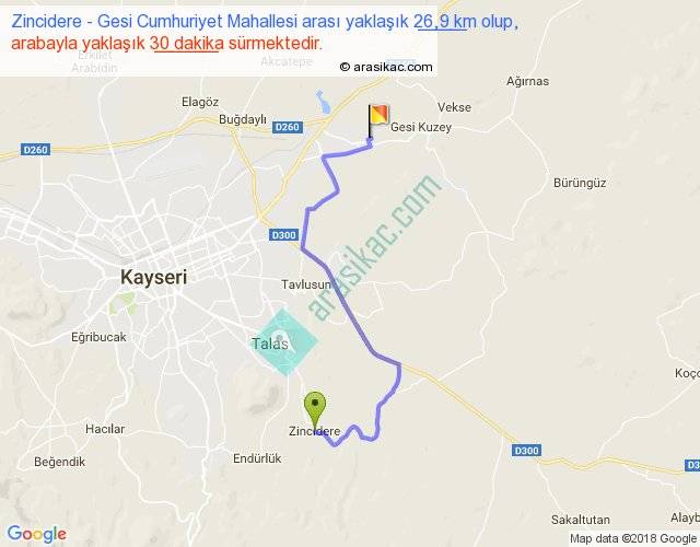 Zincidere - Gesi Cumhuriyet Mahallesi arası yaklaşık olarak 90 km/h ile yukarıda belirtilen sürede olup, iki yerin kuş uçuşu uzaklığı (mesafesi) 16'dir. Yolculuk otobüsle 39 dakika sürmektedir.
