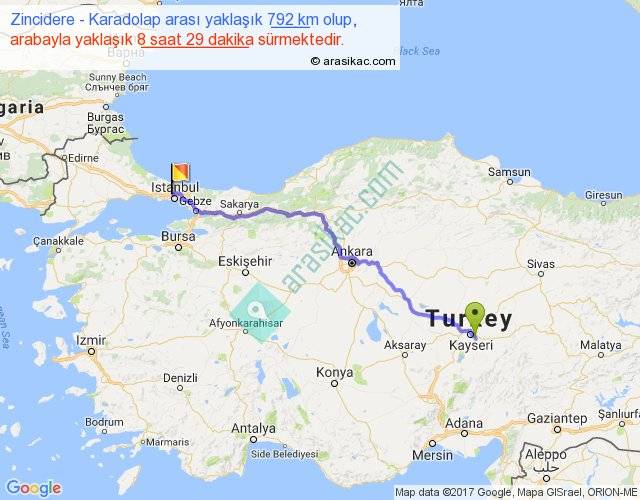 Zincidere - Karadolap arası yaklaşık olarak 90 km/h ile yukarıda belirtilen sürede olup, iki yerin kuş uçuşu uzaklığı (mesafesi) 625'dir. Eğer belirtilen yerler arasında uçak seferi var ise bu süre uçakla 57 dakika'ya kadar düşebilir. Yolculuk otobüsle 11 saat 1 dakika sürmektedir.