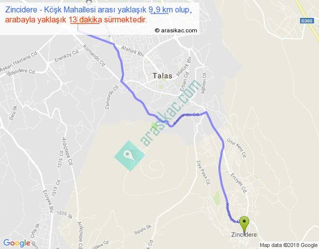 Zincidere - Köşk Mahallesi arası yaklaşık olarak 90 km/h ile yukarıda belirtilen sürede olup, iki yerin kuş uçuşu uzaklığı (mesafesi) 8'dir. Yolculuk otobüsle 16 dakika sürmektedir.