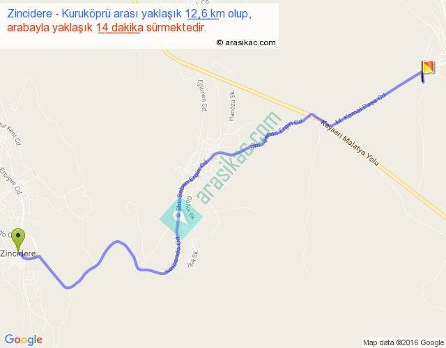Zincidere - Kuruköprü arası yaklaşık olarak 90 km/h ile yukarıda belirtilen sürede olup, iki yerin kuş uçuşu uzaklığı (mesafesi) 9'dir. Yolculuk otobüsle 18 dakika sürmektedir.